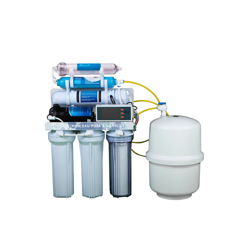 - 3 étapes : filtre sédiments, charbon actif, membrane 0,0001 µm
